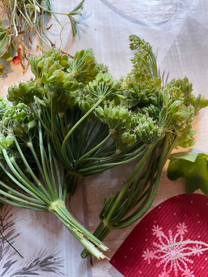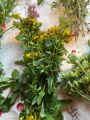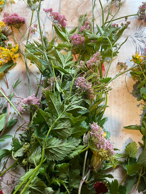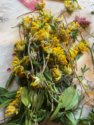 An Kräuter habe ich heute folgende gesammelt: Johanniskraut, Wundklee, süsser Alpenklee, guter Heinrich, grosse Bibernelle, Frauenmantel, Schafgarbe, Wiesenbärenklausamen und Blacken. Den süssen