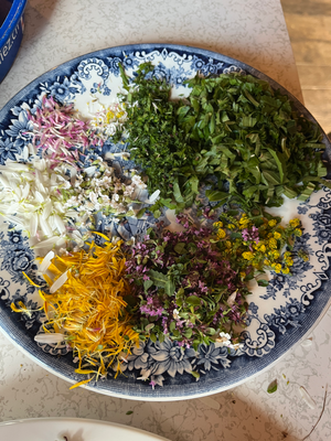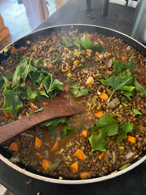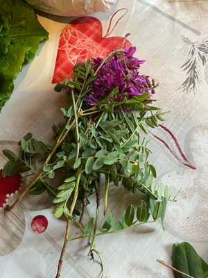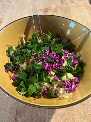 herausfordernd, aber mit meinen Notizen geht es. Zum Mittagessen habe ich einen Salat mit Weidenröschenblüten und Sauerklee gemacht und dazu eine Linsenpfanne mit Gemüse und gutem Heinrich