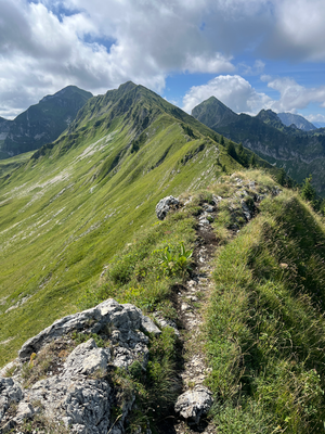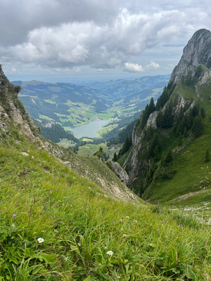 wundervoll in die Berner Alpen. Da ich ungern den gleichen rutschigen, steilen Weg zurück wollte ging ich auf der anderen Seite wieder hinunter Richtung Euschels und lief dann über den Höhenweg