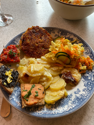 Am Frühstückstisch sitzen 13 Personen. Es ist wunderbar sich auszutauschen. Es wird über Tagespläne, Dialekte und mein Sauerteigprojekt geredet. Wir haben es zum Frühstück serviert und es kam gut