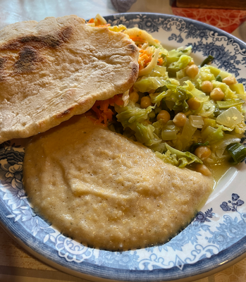 Ich habe nach dem Käsen den Zmittag vorbereitet. Es gab ein typisches Alpessen. Nanbrot mit Wirz- Lauch- Gemüse dazu Humus und Salat. Für 12 Personen war das eine lange Aufgabe. Aber auch dieses