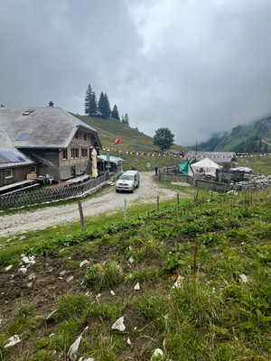 Bewölkter Himmel begrüsst uns heute. Aber es soll schön werden, deshalb wird nach dem Käse herstellen die Terasse geputzt. Kaum fertig kommen auch schon die ersten Wanderer für einen