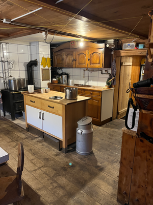 So viel los in dieser kleinen Küche, sehr herausfordernd für mich. Die schweren Milchkannen, die Gewichte für de Käse und auch die grossen Töpfe die immer im Einsatz sind bringen mich an meine