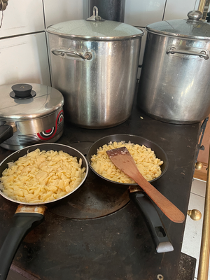paar Gäste ein, die alle Brägel (Rösti) essen möchten. So wird die Mittagspause kurz und der Platz auf dem Herd knapp. Das ist schon eine Herausforderung. Es gibt auch verschiedene Kombis. Rösti