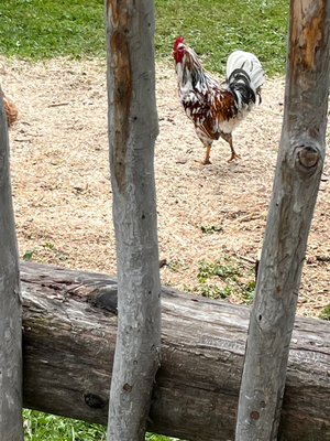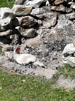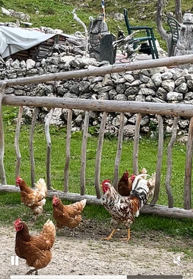 Güggel und ein Huhn geben am Nachmittag ein Duett und etwa 5 Minuten später kommt die ganze Hühnerschar und sie wandern gemeinsam an einen anderen Ort. Am Nachmittag ist es ruhig da Regen