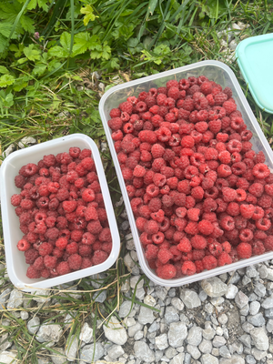 Mollige 10 Grad heute Morgen und klarer Himmel begrüssen mich. Day as usual. Käse machen, zwischendurch Frühstücken, um 10 Uhr gehe ich für zwei Stunden in die Himbeeren, sammle gleich noch