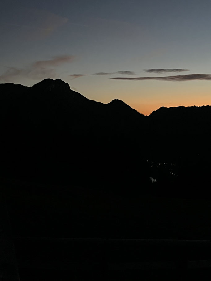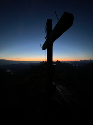 Nach einer sternenklaren Nacht machen ich und mein Mann, der gerade zu Besuch ist, uns auf den Weg zu einer Sonnenaufgangstour auf die Schopfenspitze. Bewaffnet mit einer Stirnlampe geht es um