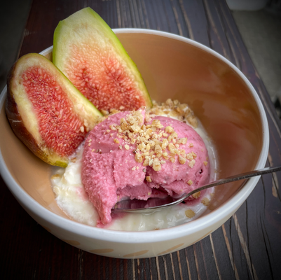 Kaffee. Zum zMittag gabs einen wunderbaren Gemüsegratin und zum Dessert aus den selbst gesuchten Himbeeren ein feines Glace mit Jogurt und Feigen.