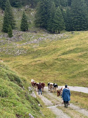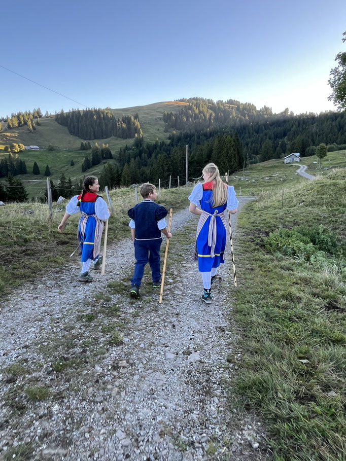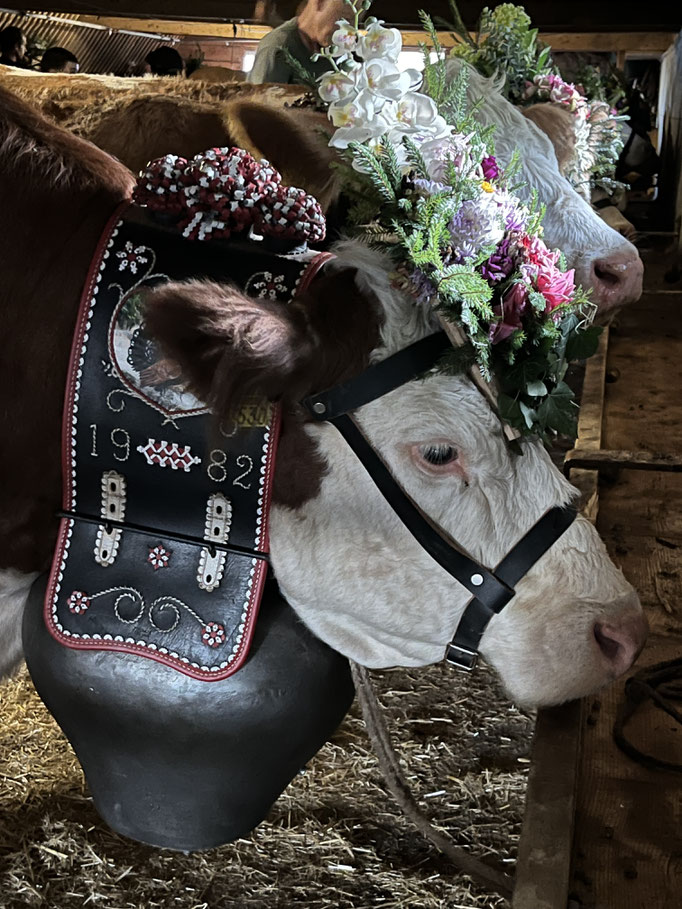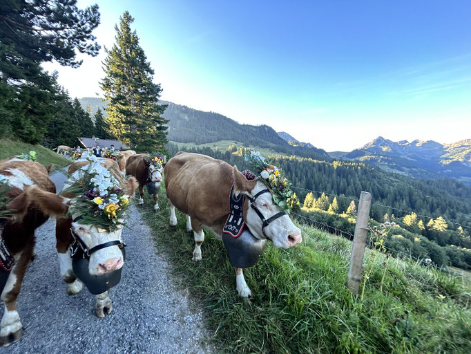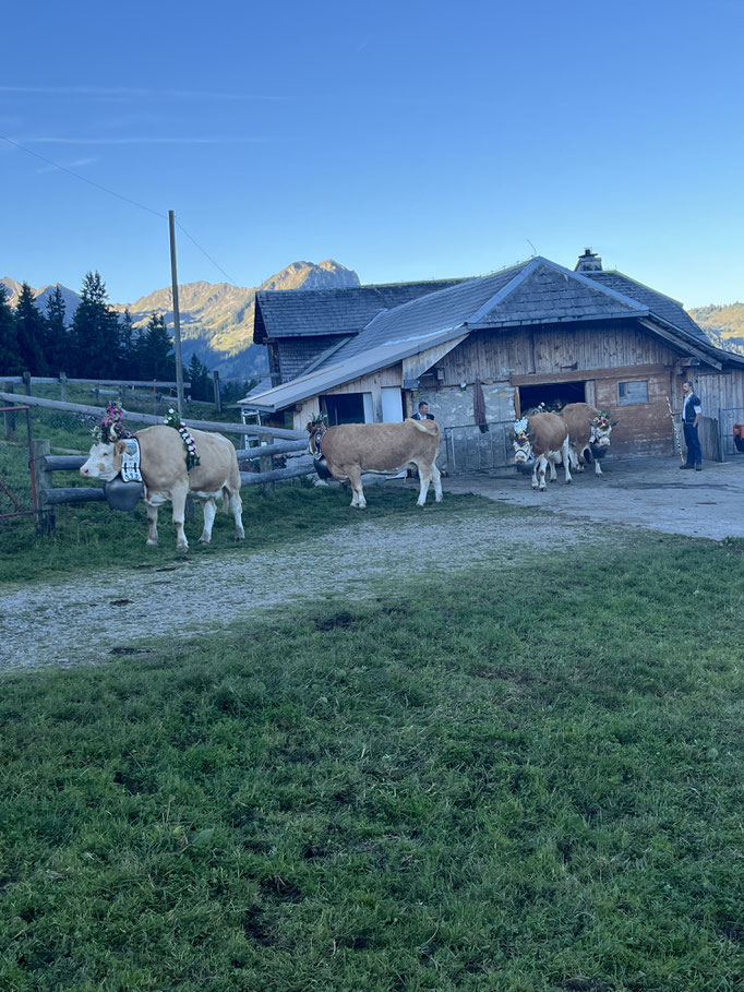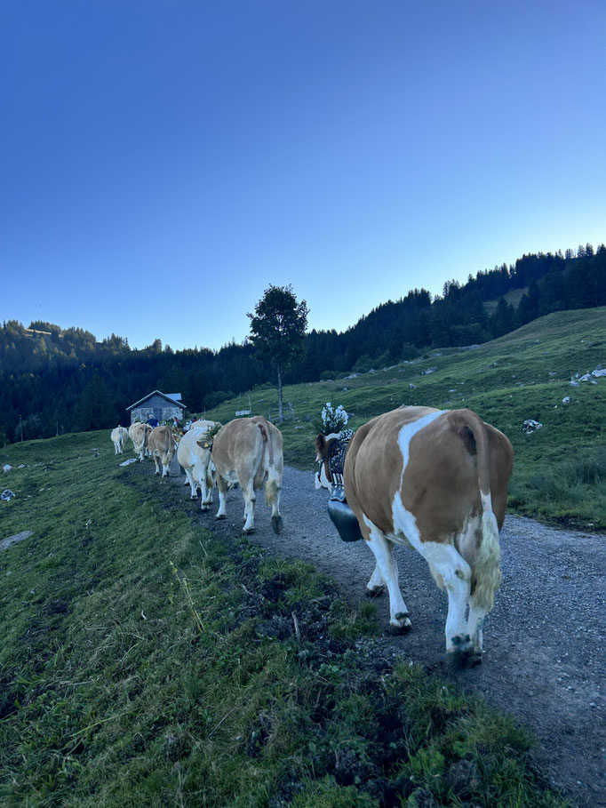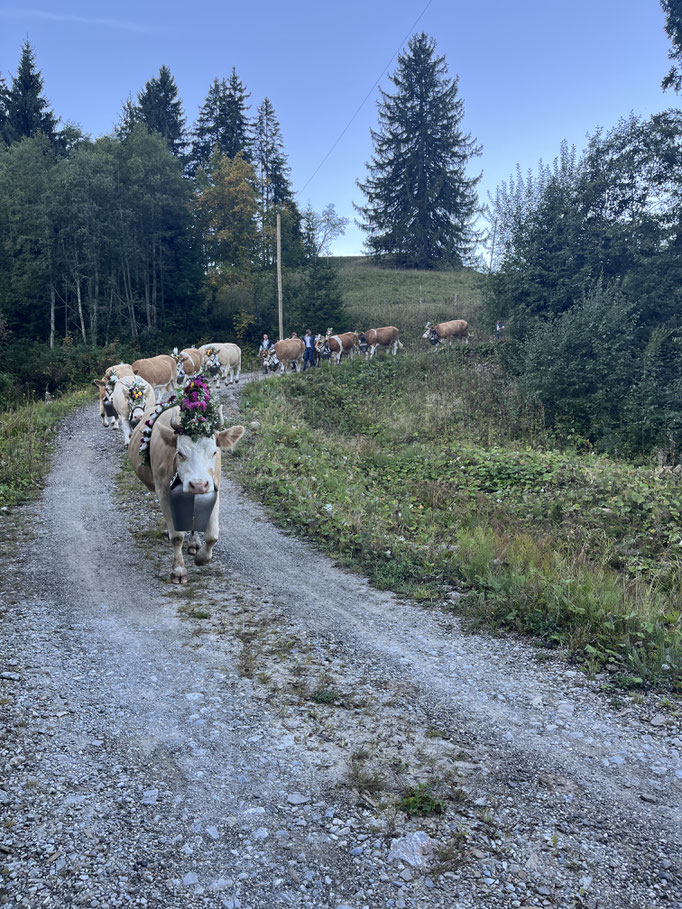 Dann gibt es ein Älplerzmorge mit Brägel und Rührei sowie Brot, Käse und Confi. Es braucht Energie für den Marsch. Nach dem Morgenessen werden die Tiere geziert. Glocken werden gegen Trychlen getauscht. Alles läuft absolut ruhig ab. Dann steigen wir alle in unsere Tracht. Das macht schon ein schönes Bild wie wir da alle herausgeputzt standen. Ich spüre die Freude bei allen Beteiligten. Ich merke, dass das etwas ganz besonderes ist und fühle mich geehrt dass ich dabei sein darf. Um 8:15 Uhr geht es los. Langsam kommen die Kühe, etwa 30 Simmentaler Prachtexemplare, aus dem Stall. Ganz vorne laufen die drei Jüngsten Alphelfer, die im Sommer auf der Alp waren, dann kommen der Bauer und der Älpler, flankiert von mir und der Dame die das ganze Jahr über den Käse schmiert.