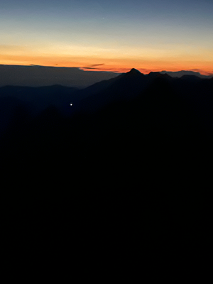 atemberaubend zu sehen wie sich der Himmel orange färbt und die Welt rundherum erwacht. Immer noch ein Bergmassiv mehr wird sichtbar und endlich hört man auch die ersten Vögel zwitschern. Um 5:45