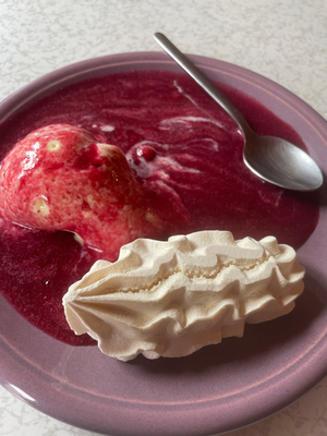ein Honigkleeeis mit wilder Beerensauce, Merengue und Rahm.