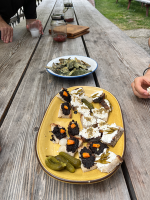 Aufstehen mit dem krähen des Hahns. Heute durfte ich da erste Mal alleine Käsen mit der Option zum Rückfragen, das war sehr beruhigend. Da wenig Gäste da waren haben wir für uns ein wunderbares Menu in Teamwork gezaubert. Auf dem Plan standen selbstgemachte, mit Gemüse und Ziger, gefüllte Ravioli, Zucchinigemüse und ein Wildkräutersalat. Der Wildkräutersalat war mein Part. Dafür habe ich Thymian, Hopfenklee, Breitwegerich, Herbstlöwenzahnblüten und Blätter, Margarithen- und Gänseblümchenblüten, Rotklee und ein wenig Fichtenspitzen gesammelt. Auch hatten wir vorne weg ein kleines Apero-Plättli mit frittierten Salbeiblättern, Ziger- und Olivenbrötchen. Zum Dessert gab es Frozen Jogurt mit Beeren und Crumble. Nach dem Essen und Abwaschen war etwas Zeit zum Wandern so habe ich eine wunderschöne Runde gemacht, die Flora und die Aussicht genossen. Danach nochmal Käse kehren und Käseschmieren. Ein kurzer Besuch bei den neun jungen Hunden.