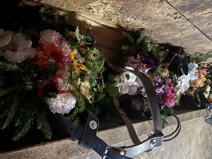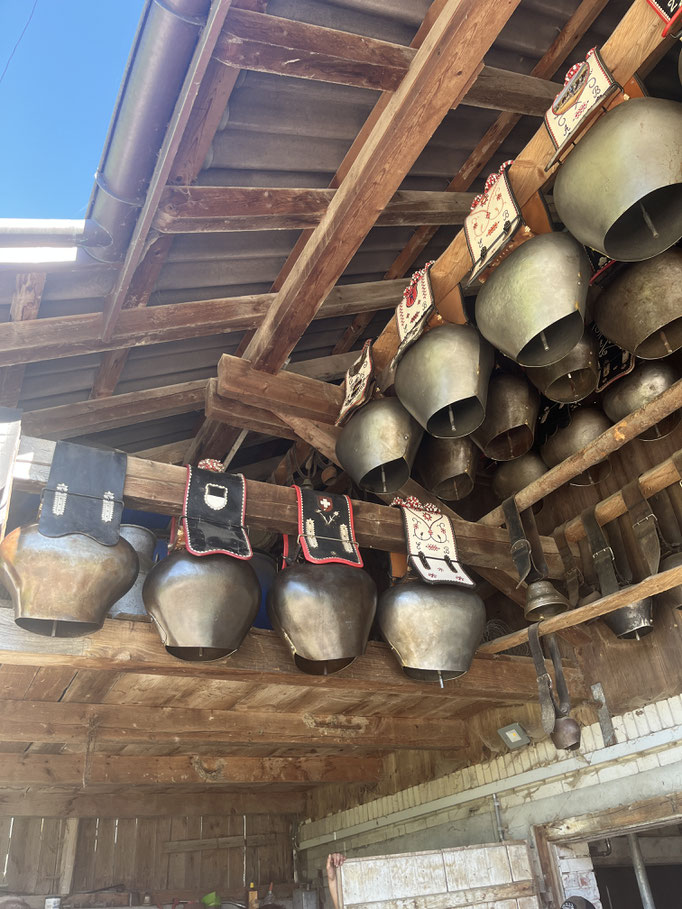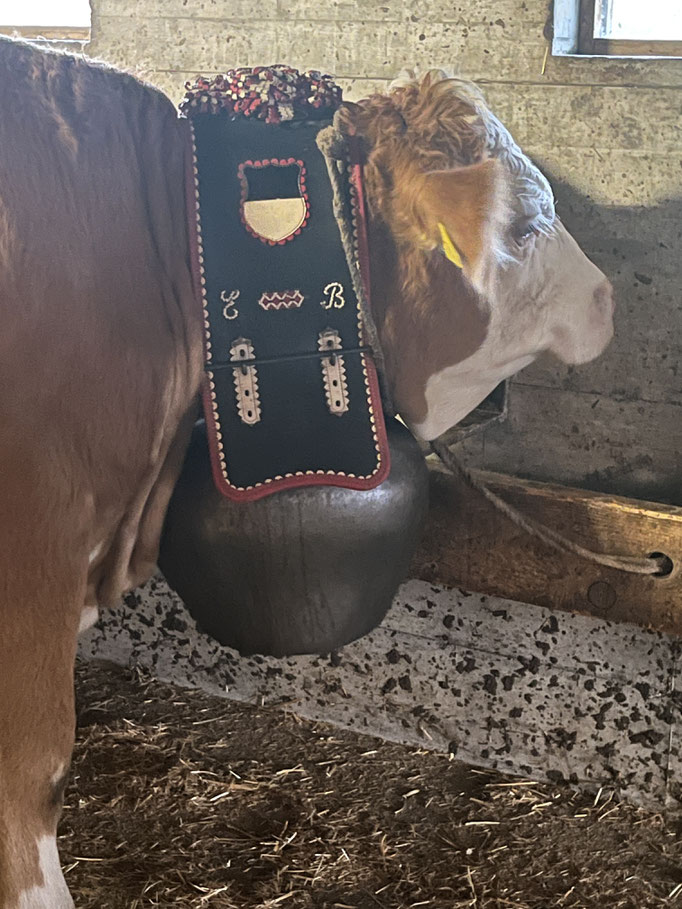 Nach 3,5 Stunden kommen wir beim Stall an. Waren die Kühe am Anfang noch stürmisch so sind sie am Ende nun doch sehr erschöpft, hungrig und durstig. Es werden alle abgeschmückt, die grossen Trychlen werden durch keine Glunggen ersetzt. Sie bekommen etwas Futter und dann müssen sie noch einmal los auf die etwa 20 Minuten entfernte Weide. Das finden sie mässig lustig. Wir anderen Helfer machen uns nach einer kurzen Trinkpause daran die Trychlen und die wunderbar bestickten Lederriemen zu waschen, putzen und ölen. Mit dem Lader werden sie nach dem Trocknen unters Dach gehängt.