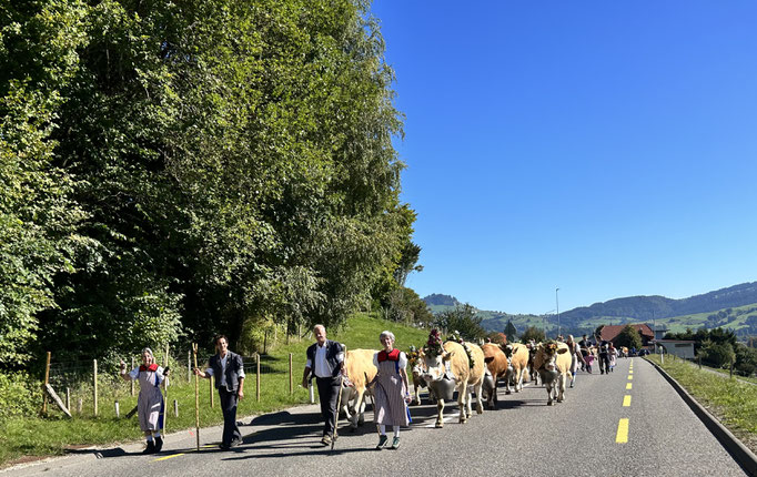 Uns folgen die Leitkuh und alle anderen dazwischen immer wieder Helfer (insgesamt 12) die schauen, dass die Tiere nicht ausscheren oder stehen bleiben. Am Anfang geht es über Kieswege durch Wald und es ist noch angenehm kühl. Die Tiere sind noch stürmisch und wir müssen schauen, dass sie nicht zu schnell gehen. Sie laufen nicht gerne auf Kies und Asphalt und versuchen wo immer möglich auf Wiesenstreifen zu gehen. Es geht wunderbar, dann ändert sich die Umgebung, wir kommen ins Tal, zwischen Häusern mit Gärten hindurch. Der Älpler hat überall wo es kritisch werden könnte Zäune oder Bänder gespannt. Man merkt die 25 Jahre Erfahrung. Wir kommen Richtung Hauptstrasse und da gibt es plötzlich Handzeichen von vorne ( die Trychlen sind zu laut als dass wir miteinander sprechen könnten), dass wir stehen bleiben müssen. Das war der Moment wo grosse Anspannung herrschte. Es ist nämlich nicht so einfach so eine Kuhkarawane zum stehen zu bringen. Da wir aber in Blöcken liefen wo immer wieder Helfer zwischen drin waren, brauchten wir nur etwa 50 Meter bis alle Tiere zum Stillstand kamen. Und dann mussten wir etwa 5 Minuten warten bis ein anderer Abzug vorbei war und dann durften wir auf die Hauptstrasse. Vorne weg hatten wir einen Motorradfahrer der die entgegenkommenden Auto-, Motorrad und Velofahrer sensibilisiert und zum anhalten aufgefordert hat. Das hat für mehr Sicherheit gesorgt, auch wenn es nicht gleich alle kapiert haben.